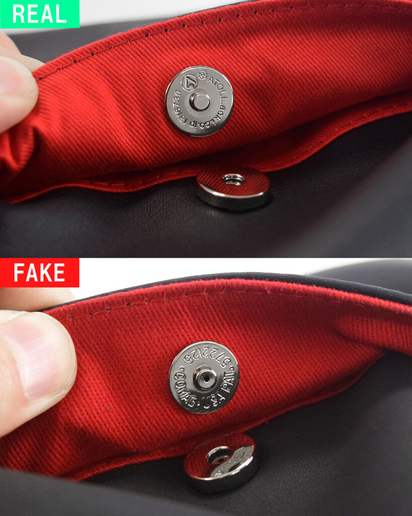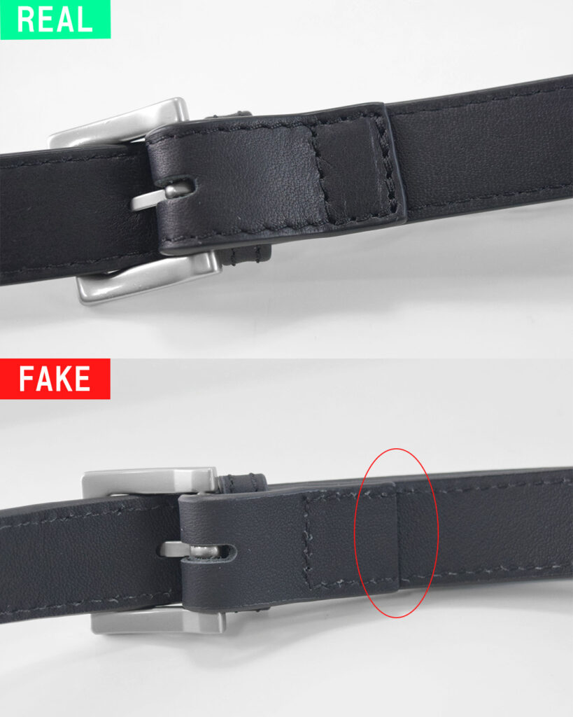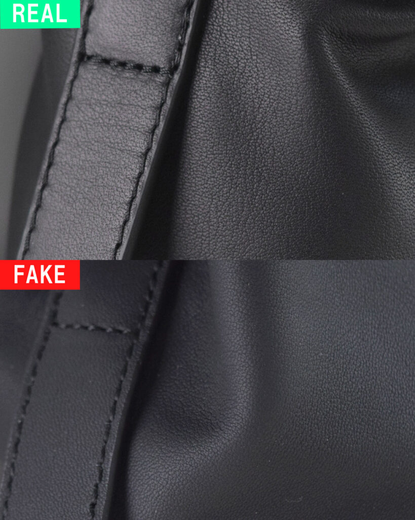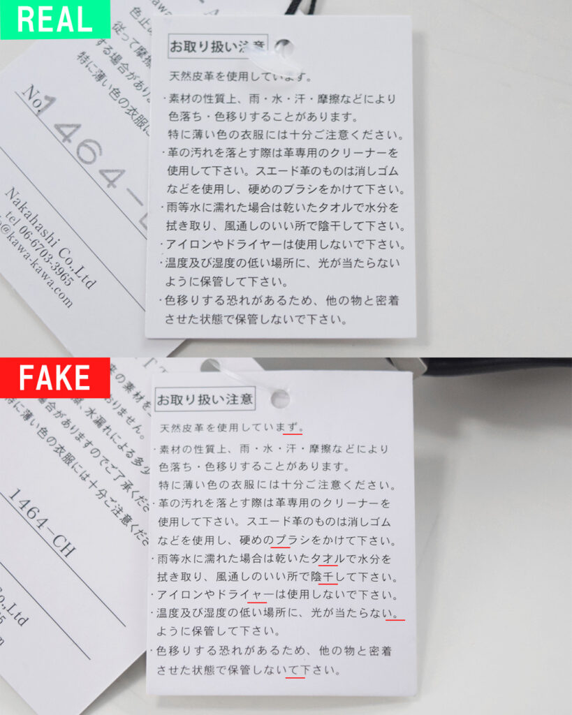 ・レザーの質感が大きく違う(本物=なめらかで柔らかい、本物でないもの=合皮のようにザラついた質感)